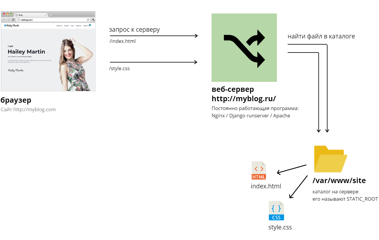 Самый простой вид сайтов — это статический сайт. Такой сайт состоит из одного HTML файла и нескольких подключаемых ресурсов — файлов статики. Чтобы опубликовать статический сайт в интернете, нужен веб-сервер, который: